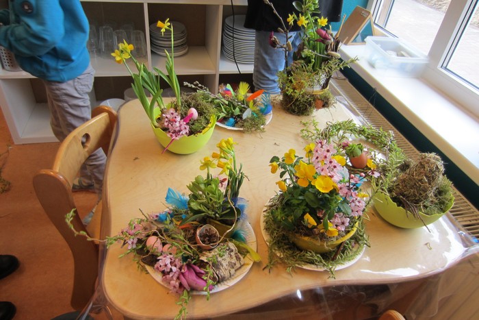 Beide Gruppen frühstückten gemeinsam an einer Tafel in einem Raum. Zusätzlich wurde der Raum in einen Blumenladen verwandelt und mit unterschiedlichen Bastelmaterialien, Sträuchern, Blumen, Rinden und Ostereiern dekoriert. Die Großeltern und Kinder konnten sich kreativ nach der Stärkung ein Ostergesteck gestalten.